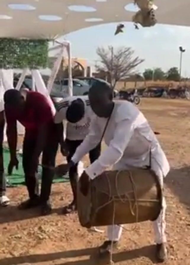 A group of men are gathered outdoors under a canopy with circular cutouts. A man in a white shirt and pants is playing a drum held in front of him. He is bending and moving as he plays. Three other men are standing around him, seemingly listening to the music and moving slightly. One man is in a white shirt, one in a red shirt, and one in a white Adidas jersey. The ground appears to be dirt or sand. There are cars parked in the background and a few buildings visible in the distance.