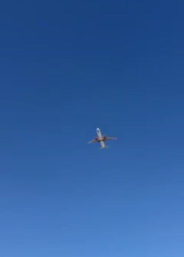 A small airplane flies against a clear blue sky. The plane is mostly white with red accents on its tail and wings. The camera angle is looking up at the plane as it flies away from the viewer.