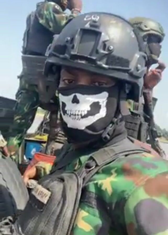 several people in military camouflage uniforms on a boat. One individual is wearing a black helmet with the letters "EG" on it, and a black face mask with a white skull printed on it. The camera appears to be held by this person. The people on the boat appear to be patrolling a river. Trees line the banks of the river in the background.
