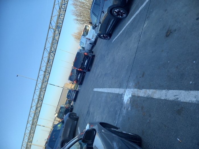 The image displays an outdoor parking lot in Nazareth, Belgium, observed under a clear blue sky during daylight. The ground consists of asphalt marked with faded white parking lines. In the immediate foreground, the front fender and tire of a dark-colored vehicle are partially visible on the left. Adjacent to a prominent white parking line, a patch of white, dried residue or spillage is present on the asphalt, near which a discarded cigarette butt lies. The parking lot contains multiple parked vehicles of various types and colors. These include a dark gray SUV, a black panel van, a black sedan, two additional black panel vans, a white panel van, and a dark gray SUV with black multi-spoke wheels visible further to the right. Additional indistinct vehicles and what appears to be a large truck are visible in the far background. A large, light-colored metal gantry or overhead structure spans horizontally across the mid-ground. Several thin utility poles extend vertically from the ground towards the sky. The background also features a line of leafless deciduous trees along the right edge and indistinct industrial-type buildings beneath the gantry. No individuals or active interactions are depicted within the scene.