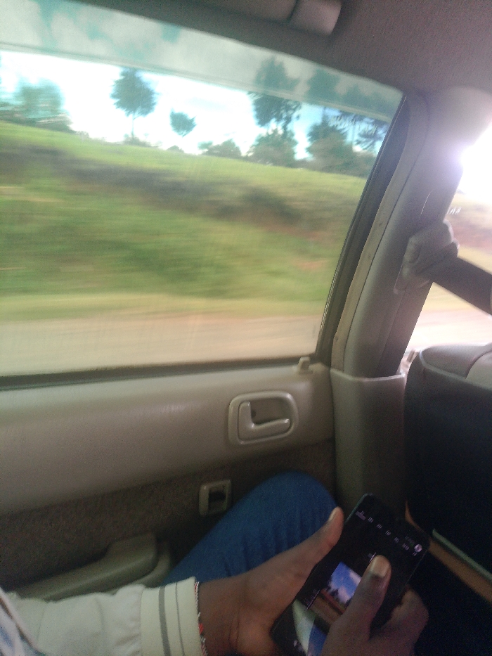 This image captures the interior of a moving vehicle, observed from a passenger's perspective, looking outward through a side window