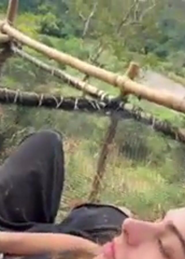 A woman with long brown hair is lying in a bamboo and net hammock. She is wearing a black top and black pants that appear to be dirty. The hammock is built overlooking a lush green valley with trees. A plastic water bottle lies near her feet in the hammock. The camera is angled above the woman, looking down at her. The surrounding environment appears to be a natural setting. The video is taken outdoors during the day.