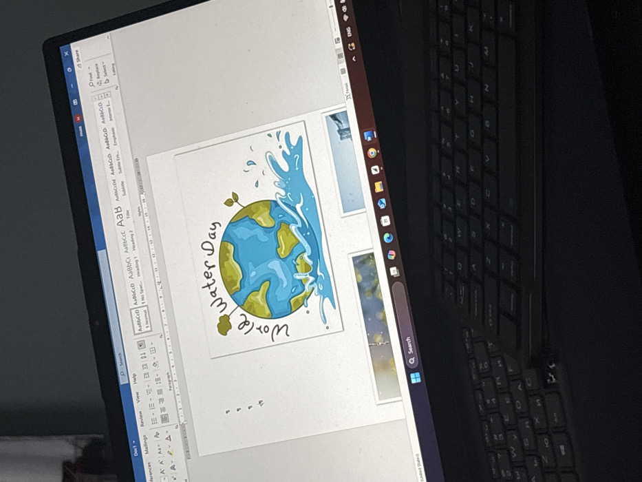 The scene depicts a dark-colored laptop displaying a Microsoft Word document, located in the city of Nadarevo, Bulgaria. The laptop screen shows a central illustration of the Earth surrounded by splashing water, accompanied by the text "World Water Day". Below this, smaller image thumbnails are visible within the document or application interface. The Microsoft Word ribbon menu is active at the top of the screen, displaying standard options, with the document titled "Doc1". The Windows 11 taskbar is present at the bottom of the screen, showing various pinned application icons including web browsers and utility tools, along with system tray icons indicating an English language setting. The top portion of the laptop's keyboard is visible below the screen, featuring a QWERTY layout with visible Cyrillic characters, suggesting a Bulgarian or dual-language keyboard. The background environment is indistinct and dimly lit. No individuals are visible.