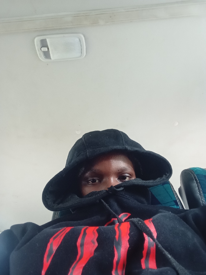 A close-up image shows an individual seated within the interior of a vehicle, located in Mbaruk/Eburu ward, Kenya. The individual, whose gender is not discernible, is wearing a black hooded sweatshirt. The hood is up, and the garment's fabric is pulled up to obscure the nose and mouth, leaving only the eyes and forehead exposed. The eyes are dark and look directly towards the camera. The front of the black sweatshirt features a prominent red design consisting of several vertical, somewhat jagged or wavy shapes. Above the individual, a rectangular white plastic overhead light fixture is visible on the light-colored, possibly white or off-white, ceiling of the vehicle. To the right of the individual, a portion of a vehicle seat with a blue and green plaid or striped fabric pattern and black trim is visible.