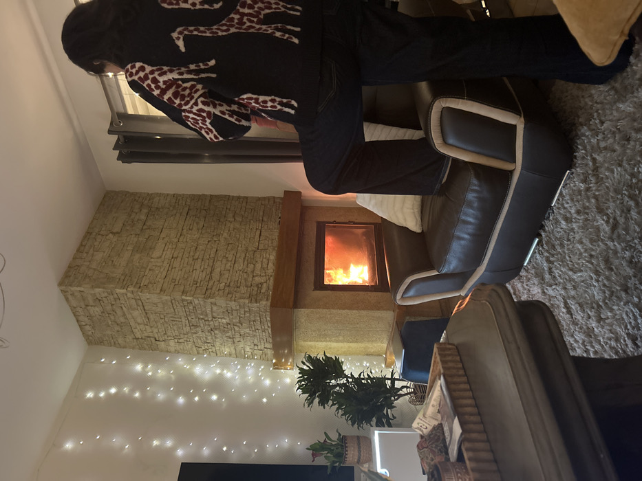 The image depicts an indoor domestic scene, specifically a living room, located in Saint-Quentin, France. A person, observed from the back and right side, occupies the right half of the frame. This individual is wearing a dark-colored sweater adorned with multiple red and white giraffe patterns, and dark trousers. The person is positioned with their right foot on the seat cushion of a brown leather armchair, while their left foot is on the floor, suggesting an unconventional stance atop the furniture. In the background, a prominent fireplace with a light-colored, textured stone facade and a wooden mantel is actively burning, with visible flames contained within a glass-fronted insert. To the left of the fireplace, a white storage unit holds two potted plants, one with pink flowers and another with dark green foliage. A larger, dark green potted plant in a woven basket stands on the floor next to the fireplace. The wall to the left of the fireplace is illuminated by multiple strands of white string lights. A dark, flat-screen television is partially visible on the far left. The floor is covered with a light-colored, shaggy rug. A dark, ornate coffee table with a woven tray containing papers and a dark bowl is visible in the lower left foreground. A window with dark curtains is visible behind the person on the right. Artificial lighting creates a warm ambiance within the room.