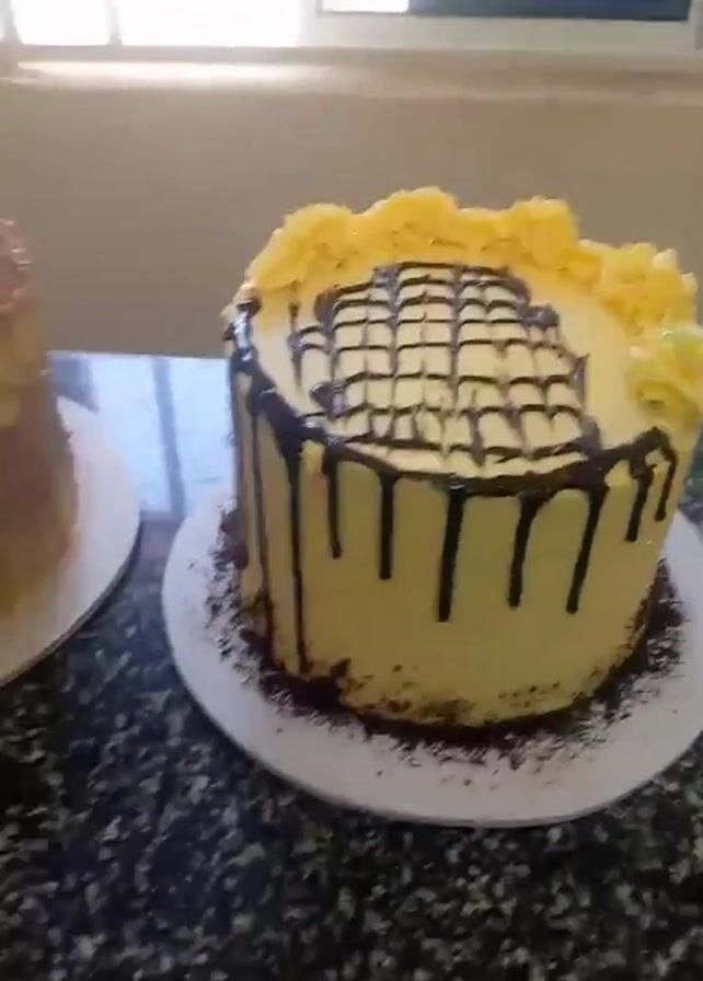 The video showcases several decorated cakes arranged on a speckled granite countertop in what appears to be a kitchen or bakery setting. The cakes are all round, with varying frosting designs and colors. One cake has a yellow frosting with chocolate drizzle and a grid pattern on top. Another has purple and gold frosting in a textured petal-like design. Additional cakes include a teal cake with vertical lines, and a pink cake adorned with colorful sprinkles. A window is visible in the background, providing natural light to the room.