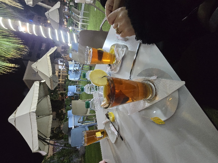 An outdoor café scene presents three beverages on a white table. The drinks, presumably tea or iced tea, are served in tall glasses with lemon garnishes. Each glass sits atop a small white plate, accompanied by a napkin. Beyond the table, the café extends into the night, marked by string lights and white umbrellas shading numerous tables and chairs. A palm tree adds a tropical touch to the ambiance. A person with dark clothing appears in the frame.