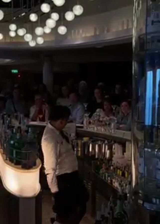 In a bar setting under a constellation of globe lights, a bartender performs a series of flair bartending tricks for an audience