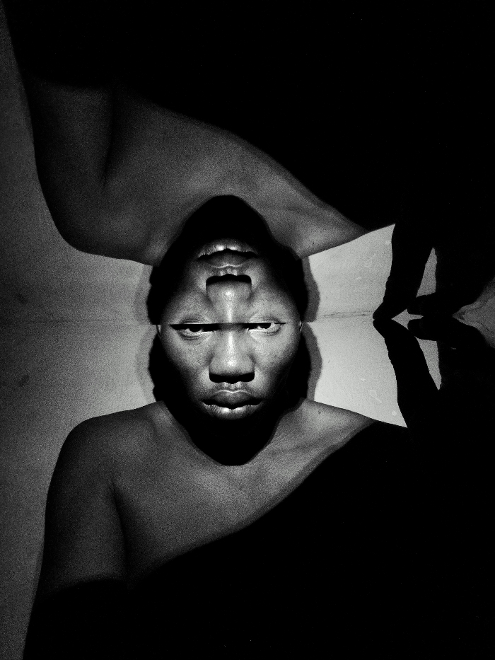 This black and white, high-contrast photograph depicts a single individual, presented as a manipulated portrait. The subject, a person with dark skin, is shown from the chest up, facing directly forward. The face is horizontally split at eye level. The lower half of the face displays a direct, intense stare from closed or narrowed eyes, a nose, and closed lips. Directly above this, an inverted reflection of a face is visible, showing an open mouth, nostrils, and what appear to be closed or narrowed eyes, mirroring the lower half's structure upside down, creating a symmetrical but distorted dual-faced appearance. The subject appears bare-chested, with visible shoulders and upper arms. In the upper right quadrant, dark, silhouetted shapes resembling fingers or a hand are visible, interacting with a lighter, rectangular surface, possibly a card or paper, casting sharp shadows. Another arm or shoulder-like form is visible in the upper left, contributing to the symmetrical composition. The background is a plain, light-colored surface, likely a wall, transitioning into deep shadows. Dramatic, directional lighting from above-front casts harsh shadows beneath the chin, around the eyes, and on the shoulders, emphasizing contours and creating stark contrasts. The image exhibits a visible film grain or digital noise. The scene is set in Keffi, Nigeria.