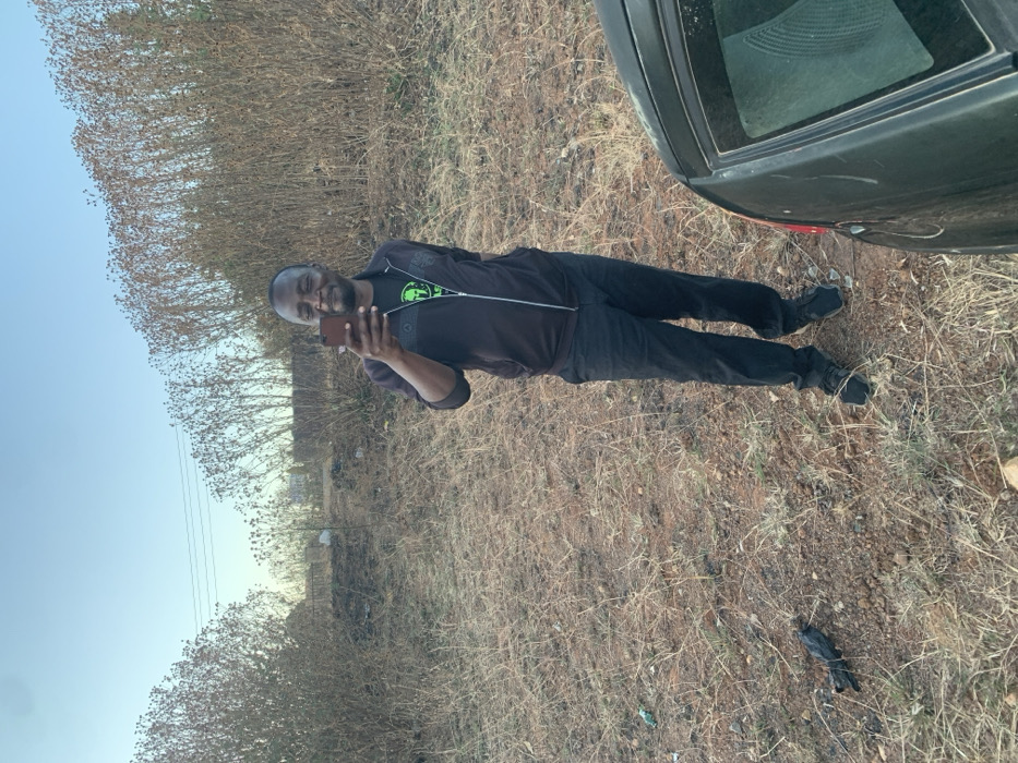 A man stands in a field of dry grass near the back of a dark car. He wears black pants and a dark jacket with a green design. The man holds a smartphone and smiles at the camera. In the background, bare trees line the edge of the field under a clear sky. A black object lies on the ground near his feet.