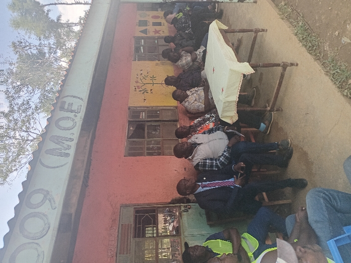 The image depicts an outdoor gathering in Idakho Central ward, Kenya, in front of a single-story building