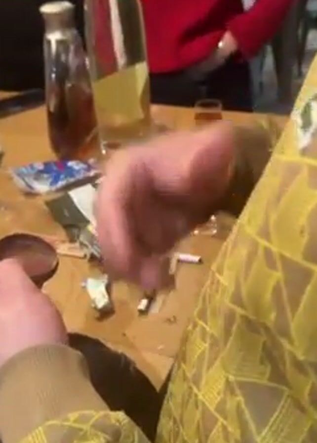 person sitting at a table and rolling what appears to be a marijuana cigarette. The person wears a tan shirt with a yellow geometric pattern. The table has several items on it, including two bottles of liquid, two small glasses of liquid, a pack of rolling papers, a partially rolled marijuana cigarette, a lighter, a cigarette, a tin, and a phone. The background includes other people sitting at a table. One person is wearing a red sweater. The environment looks like someone's dining area. The table is wooden.