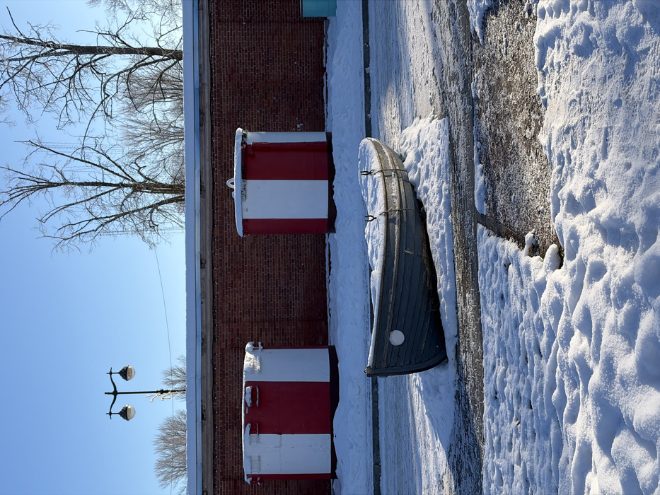 The scene depicts a snow-covered outdoor area in Kronstadt, Russia, under a clear blue sky. No individuals are present. In the foreground, a dark-colored wooden rowboat, approximately 3.5 meters long, rests diagonally on an irregular patch of snow and dark asphalt. The boat's bow is oriented towards the left, displaying a lighter circular detail on its port side, while two dark metal rings are visible on its interior near the stern. Snow partially fills the boat and accumulates around its base. The ground consists of uneven fresh snow and exposed sections of dark pavement. In the midground, two large, cylindrical objects, resembling maritime buoys, are positioned on the snow-covered ground. Both are painted with alternating vertical red and white stripes and have snow accumulated on their tops. The cylinder on the left is broader, while the one on the right is taller and narrower. A reddish-brown brick wall forms the background, topped by a horizontal line of accumulated snow. Above the wall, a black, ornate street lamp with two globes is visible on the upper left. Bare deciduous trees with intricate branch patterns are silhouetted against the bright blue sky, with some displaying decorative string lights on the right.