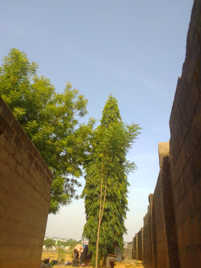This image depicts an outdoor scene in Saminaka, Nigeria, between two unplastered, light brown brick walls. The left wall partially frames a large, green-leafed tree. The right wall extends into the distance, featuring several buttresses or columns. A tall, slender, conical tree with dense green foliage stands centrally. Beneath this tree, a male wearing a grey t-shirt and light trousers is seated on a low, irregular stone structure. To his left, a second male, clad in a plaid shirt, is bent over a dark bucket or container on the unpaved dirt ground, engaged in an activity involving items on the ground. The sky above is clear and light blue. In the distant background, a hazy horizon reveals a settlement with additional buildings and trees.