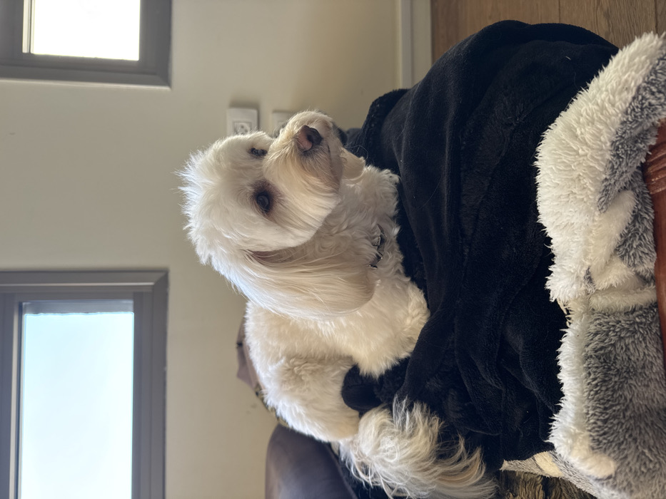 - "A white, long-haired dog, possibly a Havanese or Maltese breed, is depicted in a reclining position on a black plush blanket within an indoor domestic setting in Ramat HaSharon, Israel" by FM-XPWis2, licensed under CC BY 4.0