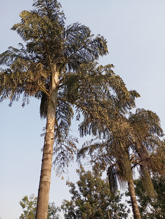 The image displays a low-angle perspective of an outdoor, vegetated environment, consistent with a setting in Jos, Nigeria. Three tall trees, appearing to be a species of palm or similar, dominate the frame against a clear, light blue sky. The most prominent tree, centrally positioned and extending upwards, features a segmented, light brown trunk. Its crown is composed of dense, green-brown fronds, from which numerous long, dark green, pendulous strands, consistent with fruit clusters, hang vertically. A second similar tree is visible to the right, partially obscured, exhibiting similar fronds and hanging structures. A third tree trunk is partially visible on the far left. Below the main canopies, a denser layer of smaller, leafy green trees is visible. The scene is illuminated by ambient daylight, casting soft light on the foliage without harsh shadows. No human figures, animals, or artificial structures are discernible. The precise location within Jos, Nigeria, is not identifiable from the visual content alone.