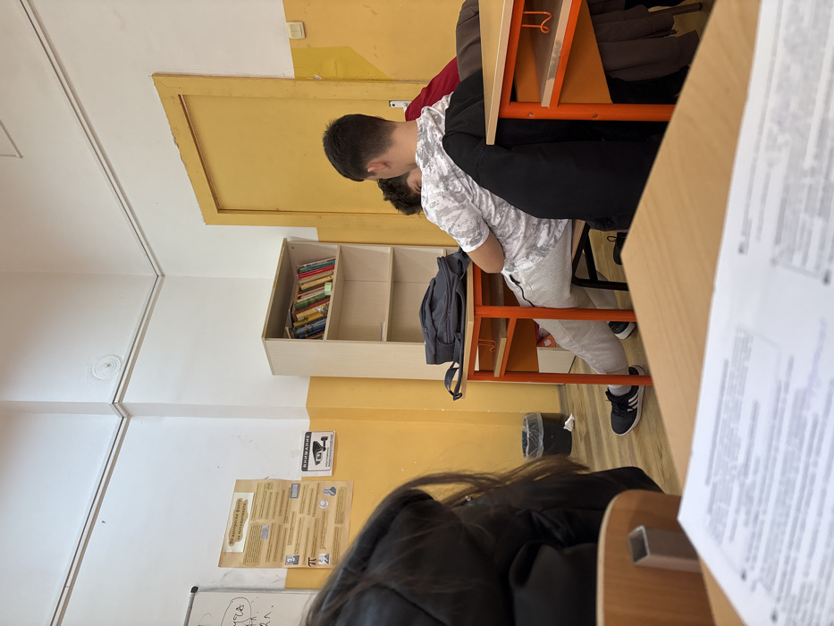 The image depicts an indoor classroom environment in Nova Zagora, Bulgaria
