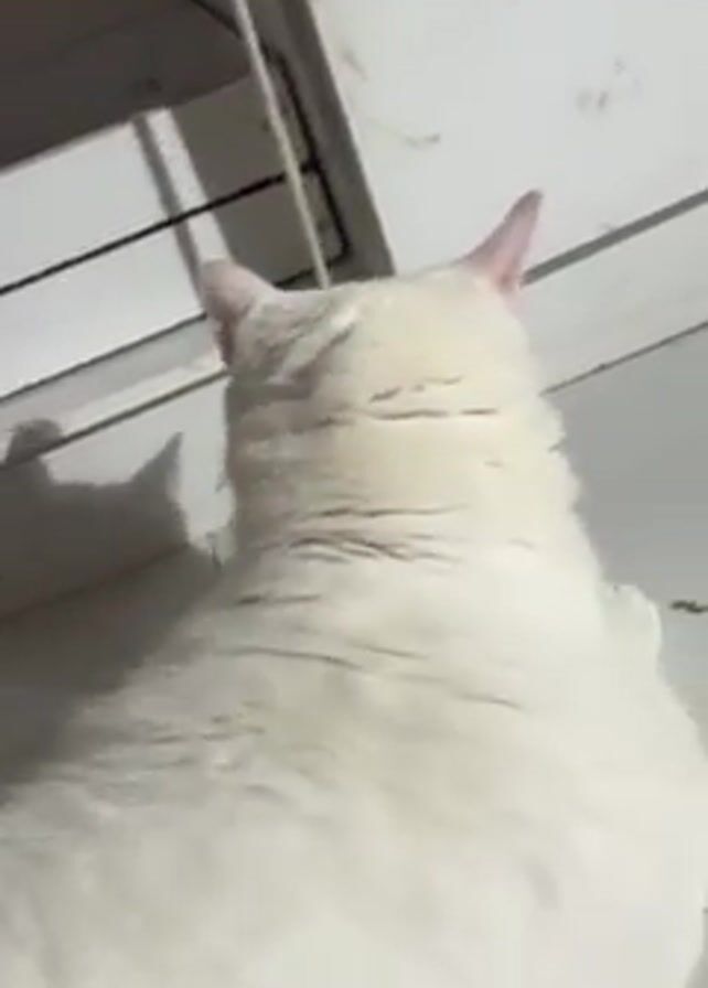 white cat standing near the corner of a room with white tiled floors