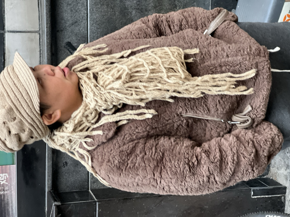 The image presents a head-and-torso view of an East Asian individual standing in Yuzhong District, China. The individual is oriented slightly to their left, with their gaze directed towards the right side of the frame. They are wearing a light beige knitted cap featuring a brim and a textured, open-weave pattern on the crown. A voluminous, heavily textured, and fringed light beige knitted scarf is wrapped around their neck. The individual is further clad in a dark brown, possibly faux fur or shearling-style jacket with a textured surface. A small, light brown accessory is observed hanging from a zipper pull on the left side of the jacket. The lower portion of the image reveals dark-colored trousers. The background consists of a dark, uniform surface, likely a wall, with a horizontal ledge visible behind the individual's head. Blurry Chinese characters are partially visible in the upper left background.