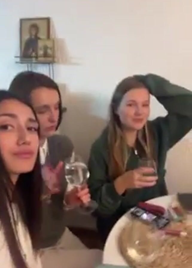 Three young women are seated around a small table. The woman to the left of the frame looks into the camera. The woman in the center takes a drink from a wine glass. The woman to the right fixes her hair and then raises her glass in a toast. The table has a woven placemat on it and a cell phone and makeup on it. A framed picture hangs on the wall in the background.