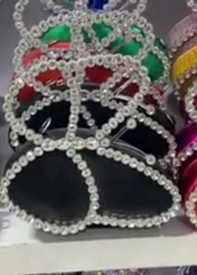 A shelf is stocked with colorful, small handbags that are lined with rhinestones. The purses are arranged by color and pattern. The purses come in colors like red, pink, green, brown, leopard print, silver, black, blue, and yellow. The camera pans out to show a wider view of the shelf.