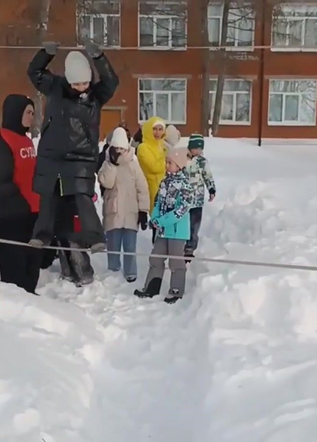 child walking on a tightrope in the snow. The child is wearing a black jacket, black pants, and a white hat. The child is holding their arms up for balance. There are several other children and adults watching the child. The background is a red brick building. The ground is covered in snow.