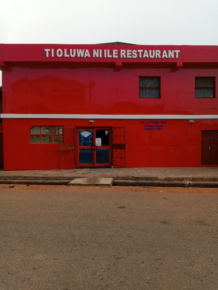 The image displays the red-painted facade of the "TI OLUWA NI ILE RESTAURANT" located at AK