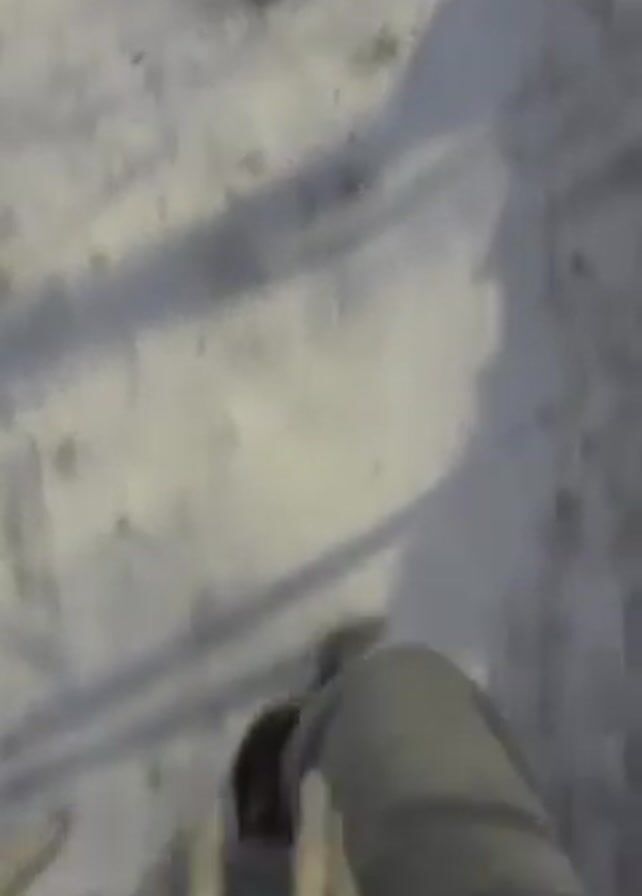 A first-person video shows a person walking in snow