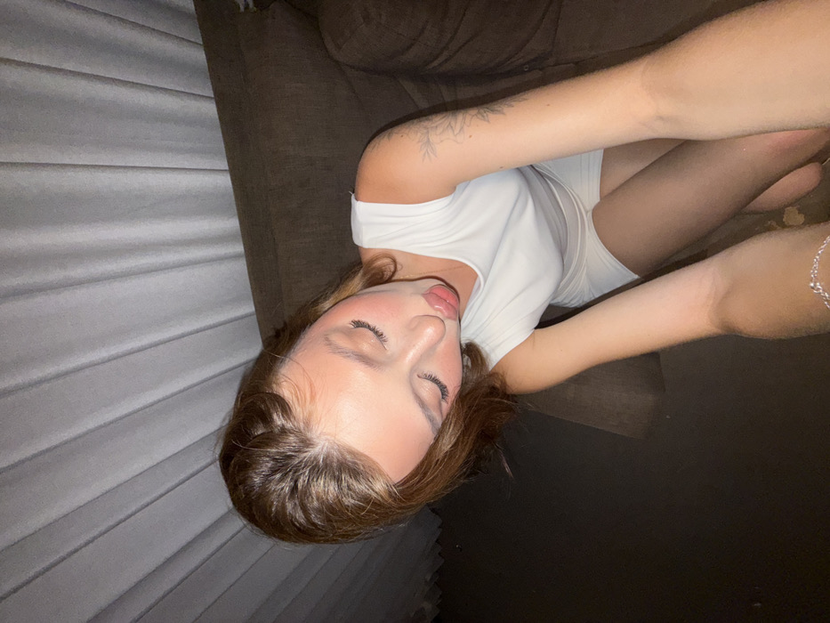 The image depicts a single young woman in an indoor residential setting within the city of Unknown, Unknown. She is observed from a high-angle perspective, seated on or immediately in front of a brown upholstered sofa. Her head is tilted downward, with her eyes downcast and lips pursed into a "kissing" or "duck face" expression, partially revealing her tongue. Her hair is light brown and appears loosely styled. She is attired in a white sleeveless top and matching white shorts. A light-colored tattoo, possibly floral, is visible on her upper left arm. Her left arm is extended towards the foreground, with a silver-colored chain bracelet adorning her wrist. The background features a light-colored, vertically pleated curtain on the left side and the brown sofa extending across the right. The scene is illuminated by an unseen artificial light source, creating a dim ambiance.