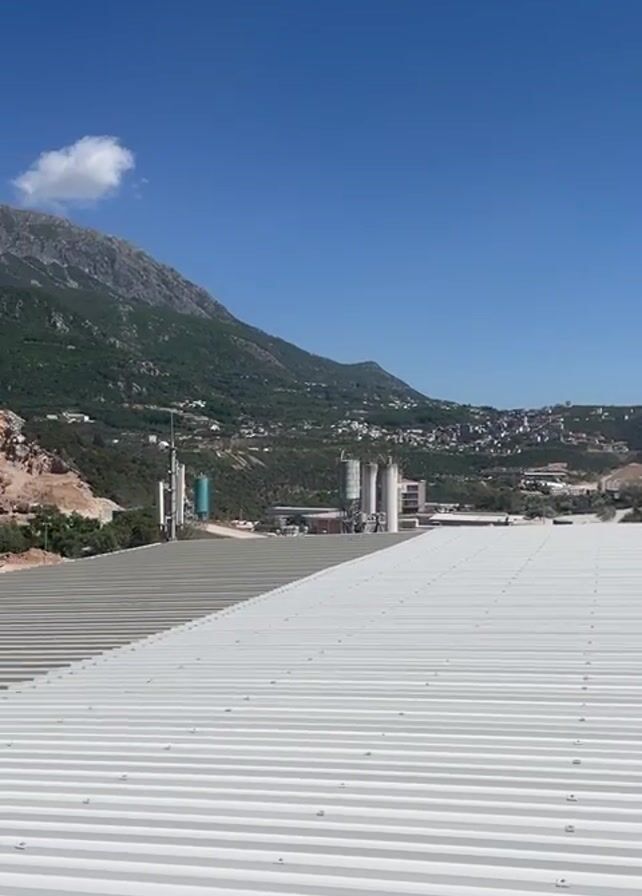 landscape panorama from a high vantage point, presumably a rooftop with a corrugated metal surface. The camera slowly pans across the scene, revealing a clear, blue sky and a mountainous backdrop. In the distance, there are buildings nestled on the hillside and various industrial structures. As the camera moves, an active construction or excavation site becomes visible. A large building with a bright yellow structure is also visible. The scene suggests an area where industrial development meets a natural, mountainous environment.