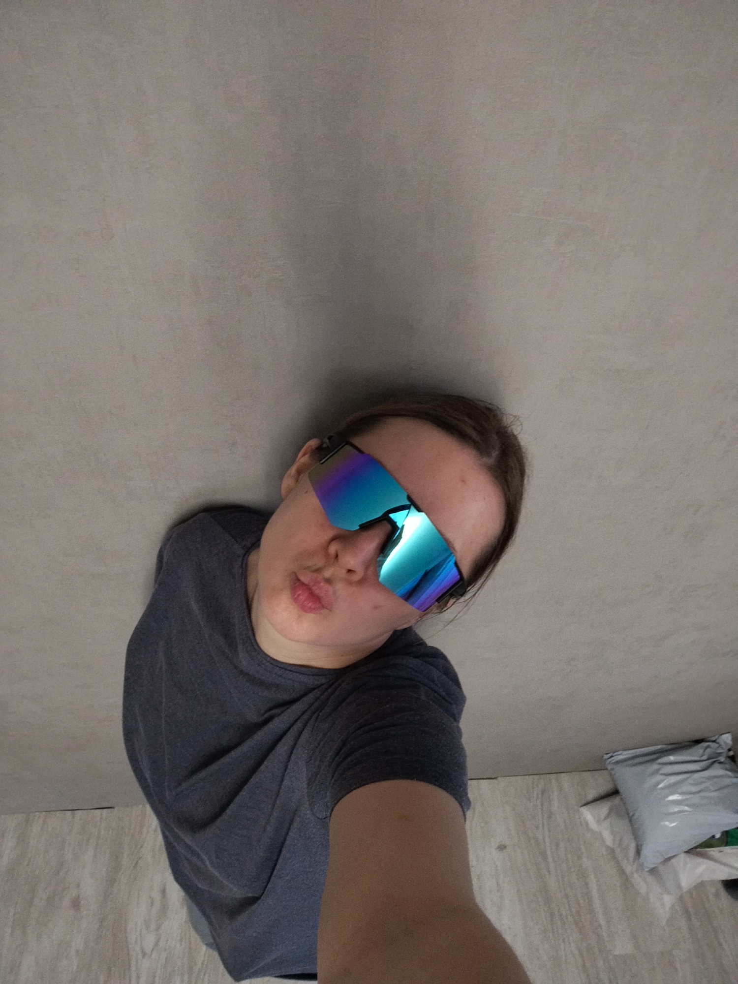 A person wearing mirrored blue sunglasses and a gray t-shirt is posing for a selfie. The person is looking towards the camera with a pursed-lip expression. The background consists of a gray wall and a section of floor with some packages. The location is Unknown, Unknown.