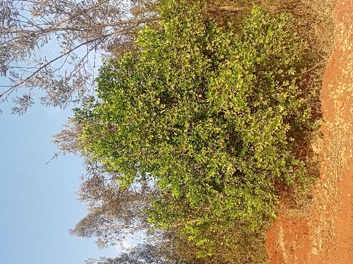 Lush green shrubbery dominates the center, fringed with brown leaves. The top left features the branches of a bare tree against a clear blue sky. To the right, a path or land area appears, characterized by reddish-brown soil and scattered vegetation. The image is oriented vertically.