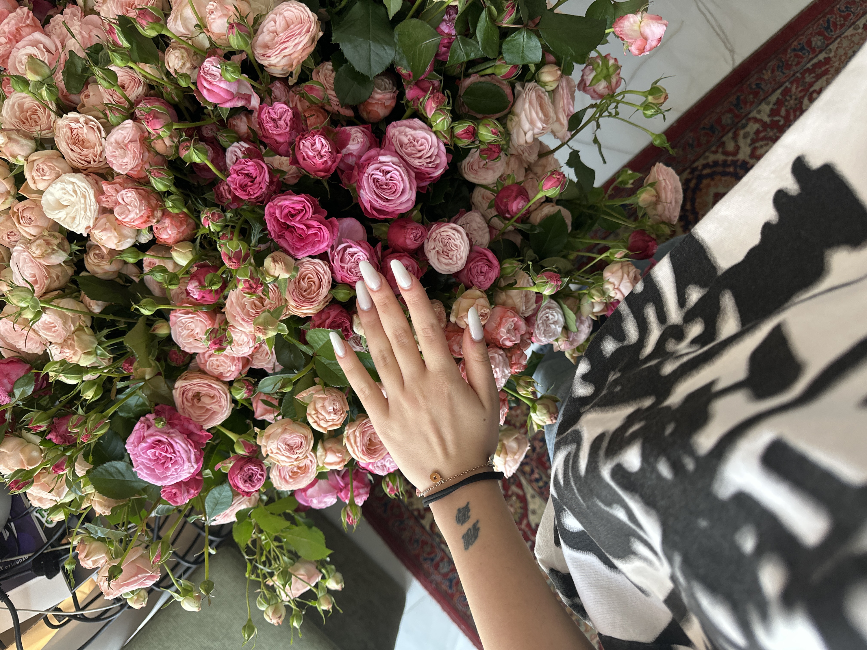 The image depicts an indoor scene in Yerevan, Armenia. A large, dense bouquet of roses fills the upper and central portions of the frame. The roses are in various stages of bloom and bud, displaying colors primarily in shades of pink, peach, cream, and deep magenta, intermingled with green leaves and stems. A left human hand, positioned near the center of the bouquet, features long, white, almond-shaped artificial fingernails. The forearm visible below the hand displays a small, dark tattoo of two stylized symbols. On the wrist, a bracelet is worn, comprising a black band and a separate thin, gold-colored chain with a small, circular, gold-colored charm. Part of the individual's attire, exhibiting a black and white abstract or animal print pattern, is visible in the lower left. The background includes a dark green upholstered surface in the upper left corner, behind which blurred dark objects resembling electronic cables and a metal structure are faintly discernible. A section of a multi-colored patterned rug, primarily red with blue and cream accents, is visible on the floor in the lower right.