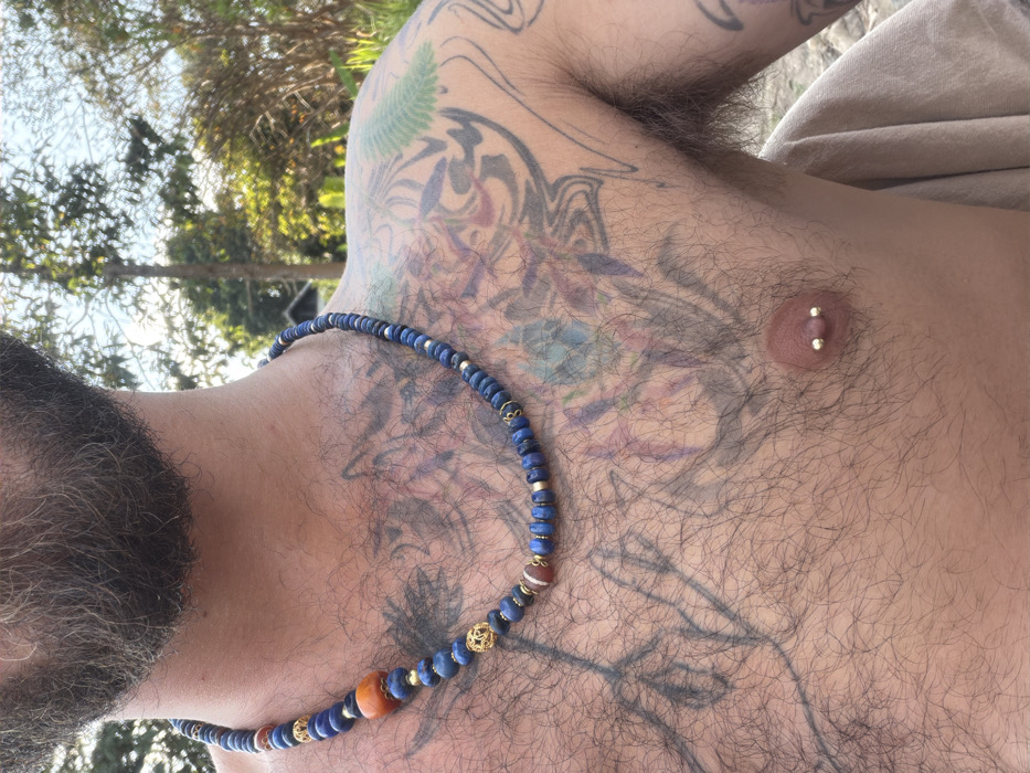A male individual is depicted in a close-up, chest-level view, outdoors in Pai, Thailand. He exhibits a dark beard on his lower face and dense body hair across his chest. Numerous tattoos are visible, covering his chest and extending onto his right shoulder; these appear to be primarily black, grey, blue, and green, with abstract and organic designs. A beaded necklace is worn, consisting of dark blue, possibly lapis lazuli, beads of varying sizes. Interspersed among these are gold-colored spherical beads, some plain and some intricately patterned, along with larger, orange-brown barrel-shaped and disc-shaped beads. A gold-colored barbell piercing is visible through the subject's right nipple. A light-colored fabric is draped over his right side, partially visible in the lower right corner. The background consists of green trees and foliage under a bright sky, indicating a daytime outdoor setting.