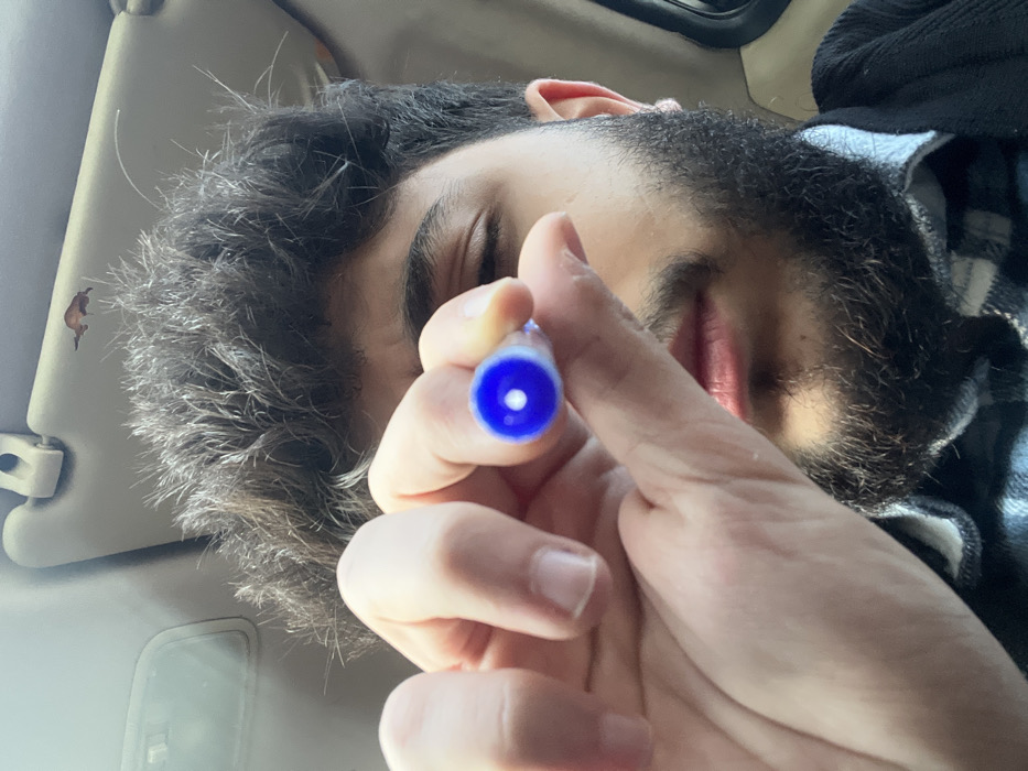 A person holds a blue pen with a white dot towards the camera. The pen obscures the face, only showing parts of the closed eye, nose, beard, and lips. The person appears to be in a car. A sun visor is visible in the upper left corner, with a small brown sticker on it. The person is wearing a dark-colored shirt with a plaid pattern.