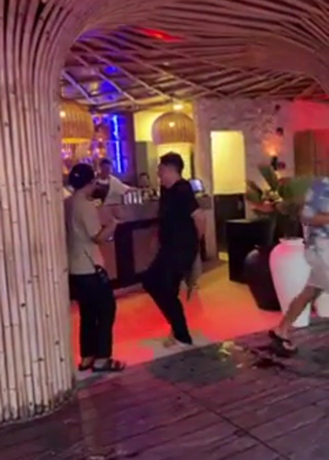 Three men are seen in what appears to be the entrance to a bar or restaurant, which has a bamboo archway and roof. The bar is visible in the background, with staff working behind it. One man is dancing in the middle, wearing a black outfit, and is holding a light-colored cloth or jacket, which he waves around. Another man, wearing a floral shirt and light-colored shorts, is watching and laughing. The third man, in a tan shirt and black pants, stands by the bamboo structure. The floor is wooden, and there are large white planters on the right side. The lighting is colorful, with red, blue, and white lights illuminating the space. Music with a distinct beat is playing.