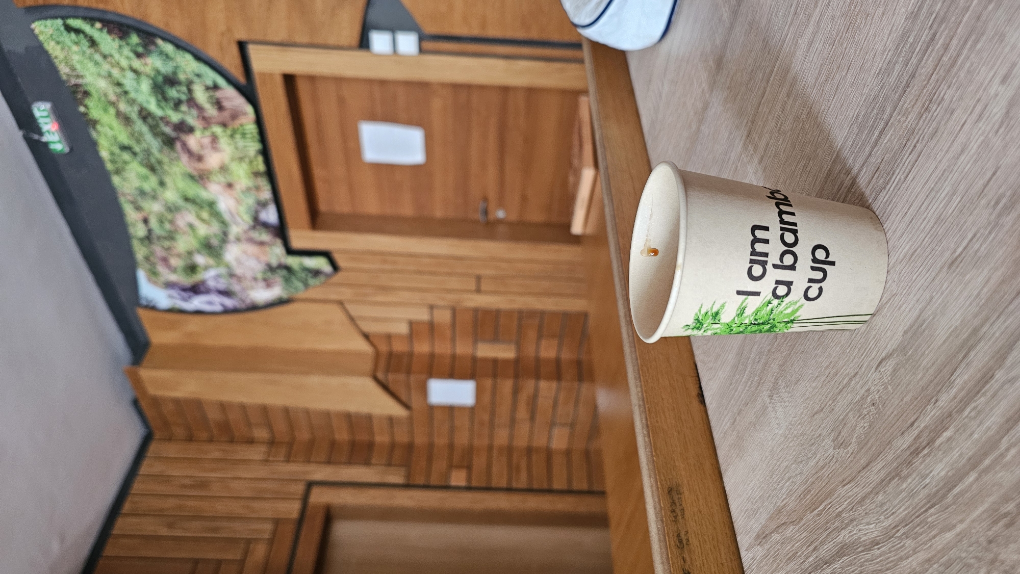 The scene depicts the interior of an indoor public or commercial building in Plovdiv, Bulgaria. In the foreground, a light-toned wooden or laminate countertop holds a beige paper cup with green bamboo graphics and the black text "I am a bamboo cup." A trace of dark liquid residue is visible inside the cup. A portion of a white object with a blue edge is visible to the right of the cup. The midground features a wooden counter or partition. The background consists of wooden paneled walls, with a stacked brick-like wood pattern on the left and vertical wood panels on the right. A wooden door with a silver handle and a small white rectangular label is present on the right wall. Above this door, a large, semicircular display shows a blurred image of green foliage. A green "EXIT" sign with red text and obscured Cyrillic lettering is mounted on a dark grey ceiling trim, below a light grey ceiling. No individuals are present.