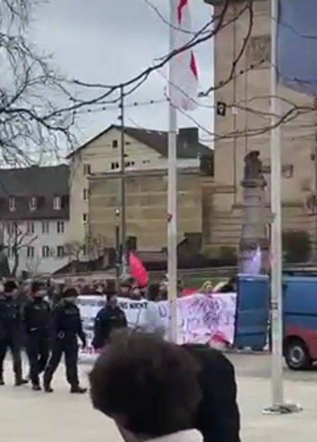 crowd of people gathered in a public square on an overcast day. Some people are carrying banners and flags. Several individuals in uniform appear to be guarding the procession. The crowd is walking towards a building with a modern, reflective facade. Three people are standing in the foreground, observing the crowd. There are bare trees lining the perimeter of the square. A light blue van is parked on the side.