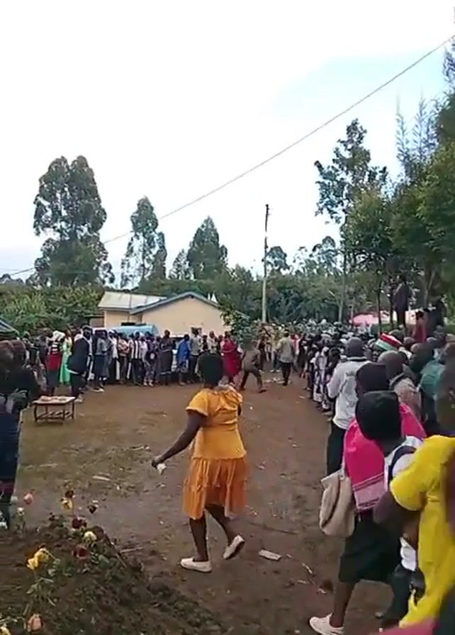 The video depicts a gathering of people in an outdoor setting. The crowd is densely packed and appears to be moving or reacting to something out of frame. Many people are wearing bright colors. A dirt road runs through the middle of the crowd, and there is a small building with a blue roof in the background. Trees line the perimeter of the gathering. A man wearing a red jacket stands in the foreground.