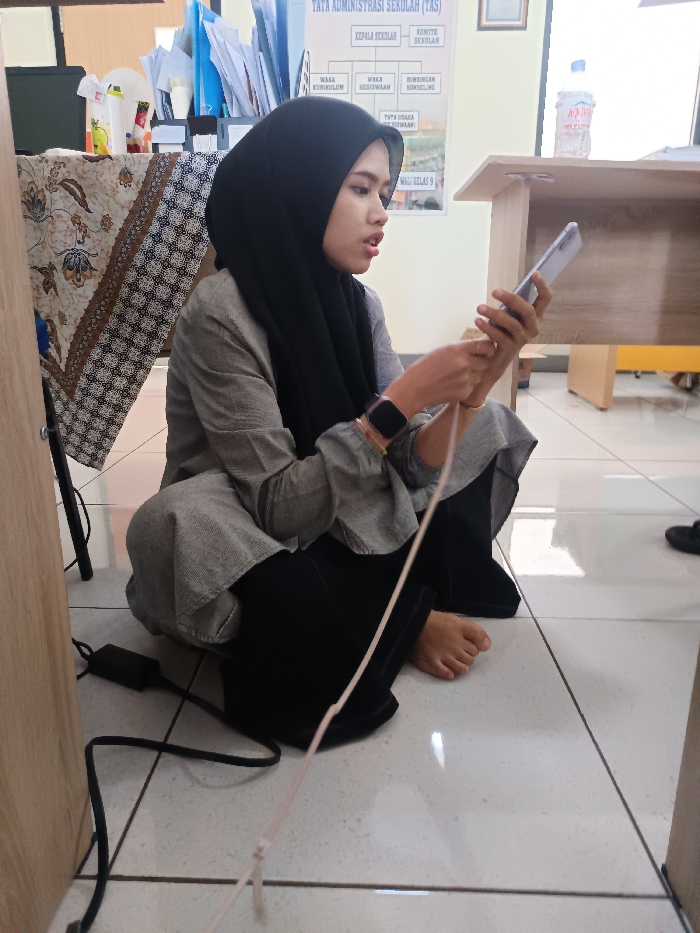A woman wearing a black hijab, a gray blouse, and black pants sits cross-legged on a white tiled floor. She is holding a cell phone in her hands and looking at it intently. A white charging cable is connected to the phone. In the background are desks, a file cabinet, and a poster with text in an Asian language. The woman is barefoot.