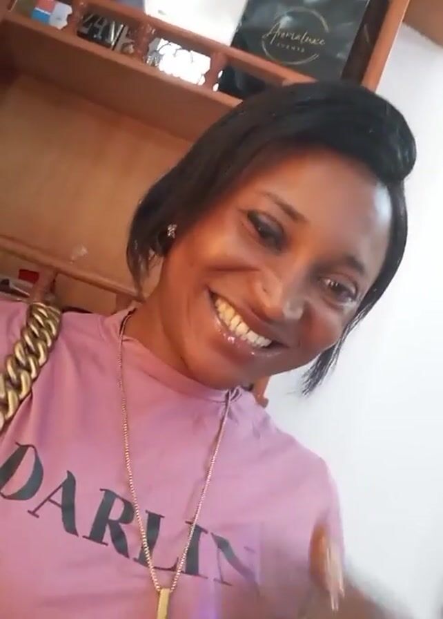 A woman is standing indoors, facing the camera and smiling broadly. She is wearing a light purple T-shirt with the word "DARLING" written on it in dark letters. She has a gold necklace with a rectangular pendant, a gold chain bag slung over her shoulder, and rings on her fingers. Her fingernails are painted a lavender color. Her hair is black, styled with a slight bump in the front. Behind her is a wooden shelf with various items, including a black shopping bag with "Aromaluxe" printed on it. The background is a plain white wall.