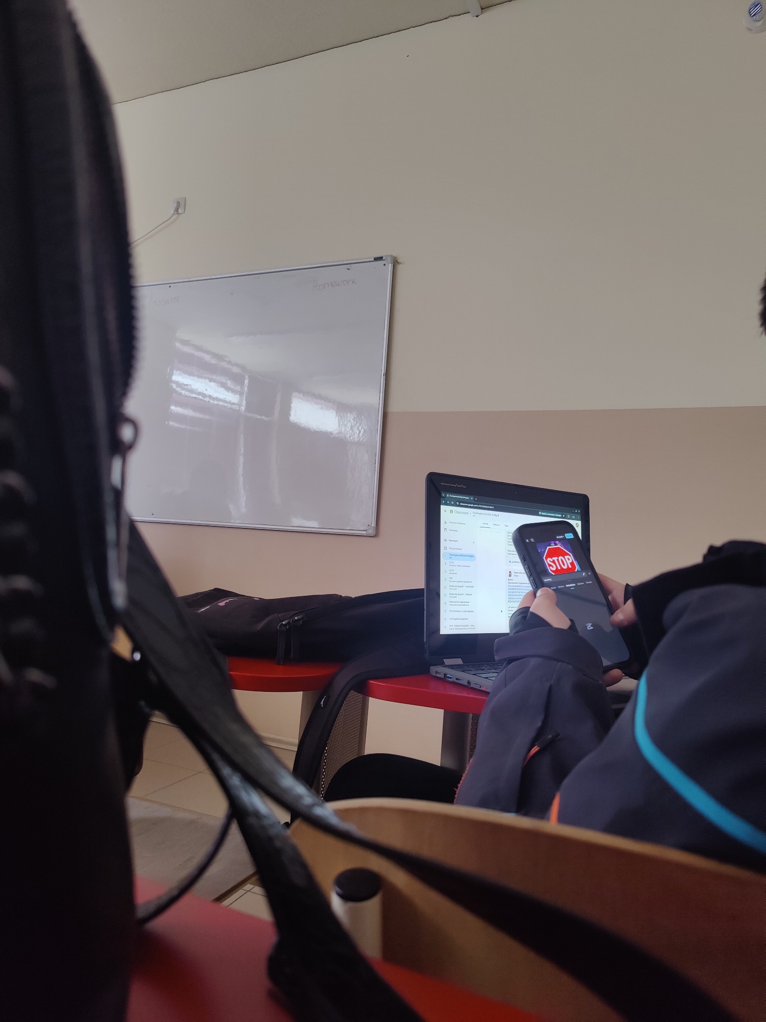 The image depicts an indoor classroom scene in Plovdiv, Bulgaria. In the foreground, out-of-focus black straps, consistent with a backpack, are visible on the left, along with the upper portion of a wooden chair back on the right. A person, viewed from behind and their right side, occupies the mid-ground, seated at a red table. This individual wears a dark blue jacket featuring a light blue stripe on the right shoulder/arm and is actively manipulating a black smartphone held vertically in both hands. The smartphone's screen prominently displays a red circular "STOP" sign graphic. An open, dark-colored laptop rests on the red table in front of the person, showing a web browser interface, specifically Google Classroom, displaying a list of items or assignments. A dark bag is situated behind the laptop on the table. The background features a light cream-colored wall on which a white whiteboard is horizontally mounted. The whiteboard reflects indistinct light sources, possibly windows, and faintly displays the words "Classroom" on the left and "Homework" on the right. A white electrical outlet with a white cable plugged in is visible on the upper left wall. The ceiling, also light-colored, includes a white, circular ceiling-mounted device (possibly a smoke detector or sensor) in the upper right area. The floor beneath the furniture consists of light-colored tiles.