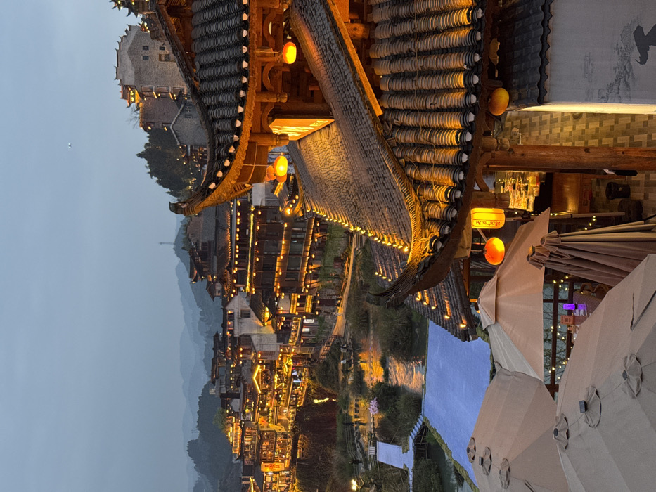 This image depicts an illuminated traditional Chinese town situated along a river at dusk in Furong, China. The scene is dominated by numerous multi-story buildings constructed in a traditional architectural style, featuring distinctive dark tiled, curved roofs and wooden elements. These structures are built into a hillside and extensively illuminated with warm orange and yellow lights, highlighting their facades, windows, and balconies, and creating reflections in the dark water of the river below. In the immediate foreground, several large beige patio umbrellas, both open and folded, are visible, indicating an outdoor seating or dining area. Below an open umbrella, a table with a small, glowing purple light source is discernible. A prominent, ornate tiled roof of a building, illuminated along its eaves, extends into the mid-right foreground. Several glowing orange and yellow traditional Chinese lanterns hang from the eaves of this structure. The central part of the image features a winding river or stream with calm water, reflecting the bright lights from the surrounding buildings. Along the left bank of the river, a section of ground or water is covered by a pale blue or white tarp-like material. Faint figures of people are visible on pathways near the river, suggesting pedestrian activity. Lush green vegetation and trees are interspersed between the buildings and along the riverbanks. In the background, additional illuminated buildings extend further up the forested hillsides. The sky is a soft, twilight blue-grey, with silhouettes of distant mountains and hills visible against it. A faint white dot, likely a distant object, is present in the upper sky, and a slender tower-like structure can be seen on a distant hilltop. No explicit interactions between individuals are discernible, but the overall environment suggests a lively evening atmosphere.