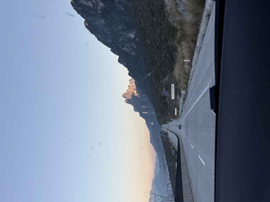 A road winding through a mountainous terrain under a clear sky. Mountains flank the left side of the road, their peaks bathed in sunlight. A vehicle travels along the road, which is marked with white lines. Road signs are visible on the mountainside, partially obscured. The right side of the frame is dominated by a dark panel, possibly part of a vehicle interior. Power lines can be seen in the distance.