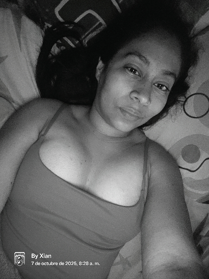 A grayscale, upward-facing selfie depicts an adult female subject lying down indoors on patterned bedding. The subject is positioned with her head towards the upper center, looking directly at the camera with a neutral to slightly smiling expression. Her dark hair is spread out behind her on the bedding. She is wearing a light-colored, scoop-neck tank top or camisole with thin shoulder straps, exposing her upper chest and shoulders. The bedding displays a geometric pattern, including partial circular and rectangular shapes. A digital timestamp in the lower left corner reads "By Xian" and "7 de octubre de 2025, 8:28 a. m.". The exact location within the city of Cali, Colombia, is not discernible from the image, but the setting is consistent with a private indoor space, likely a bedroom.