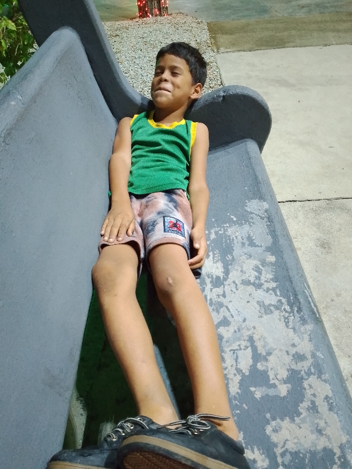 A young boy reclines on a gray bench outdoors. He wears a green tank top with yellow trim, patterned shorts, and sneakers. He is slightly smiling with his eyes squinted shut. In the background, there is greenery, concrete, and some indistinct decoration. The lighting indicates it is either dusk or dawn.
