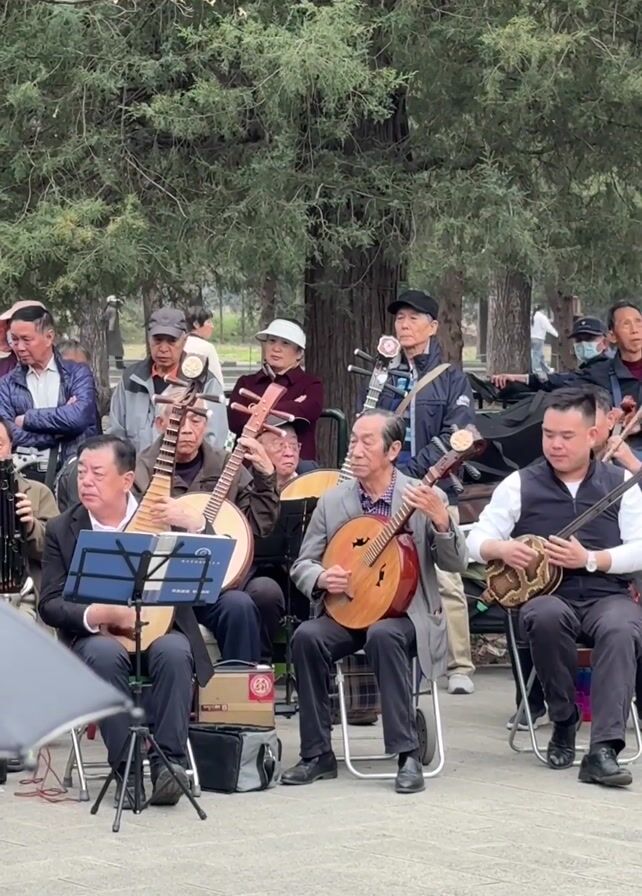 A group of approximately 15 people, mostly elderly men, are gathered outdoors in what appears to be a park setting. A central group of five men are seated on folding chairs, playing various Chinese stringed instruments including the pipa and ruan. Music stands hold sheet music in front of some of the musicians. The other individuals are standing or sitting around, seemingly observing or listening. The background consists of trees and a paved area. The mood is casual, with people dressed in everyday clothing. Some of the onlookers are partially obscured by the musicians.