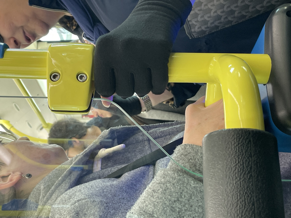 The image depicts an interior scene within a public transport vehicle, specifically a bus from the Empresa Municipal de Transportes (EMT) in Madrid, Spain, identifiable by the distinctive bright yellow support poles and grab handles. The scene is observed from a slightly elevated perspective, looking forward or across the vehicle. In the immediate foreground, a black, textured, possibly padded object, likely a seat back or handrail, occupies the lower left. To its right, a bright yellow horizontal grab handle is visible. Two individuals are prominent in the foreground. On the left, a person, identifiable by a partial profile view, wears a grey, textured winter coat with a prominent light-colored toggle closure. A small, dark, circular earring is visible on their left ear. Their bare right hand is gripping the yellow horizontal grab handle. A thin, transparent, light-green cable or wire extends from the left side towards the center. On the right, another person, also in profile, wears a dark blue jacket and a dark blue scarf. Their right hand, encased in a black glove, firmly grips a vertical bright yellow support pole. Their mouth is slightly open, suggesting they are speaking or listening. The transparent green cable passes between the two foreground individuals, nearing the gloved hand. Behind these two individuals and a clear partition (indicated by reflections and slight distortion), several other passengers are visible but out of focus. One figure on the left has dark, curly hair and appears to be wearing sunglasses. Another figure in the middle ground has a silver-colored watch on their left wrist. The overall environment suggests a crowded or moderately occupied bus interior, characterized by overhead yellow handrails and a general illumination consistent with artificial lighting inside a vehicle during daytime or evening travel.