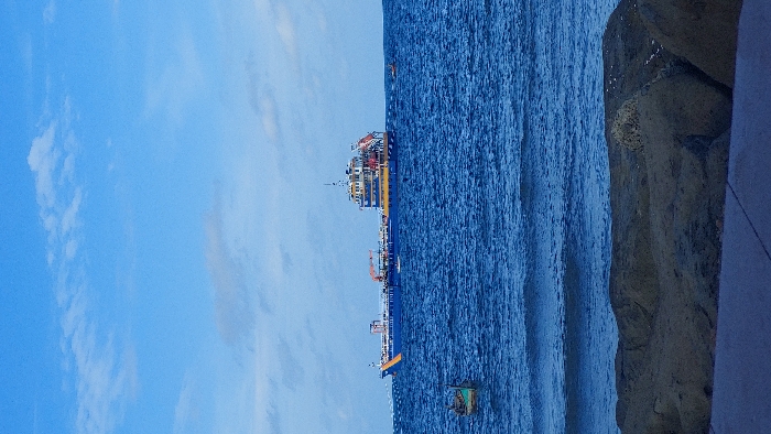 An outdoor, vertical format image depicts a daytime coastal scene in Unknown, Unknown, featuring a large vessel on open water under a partly cloudy blue sky