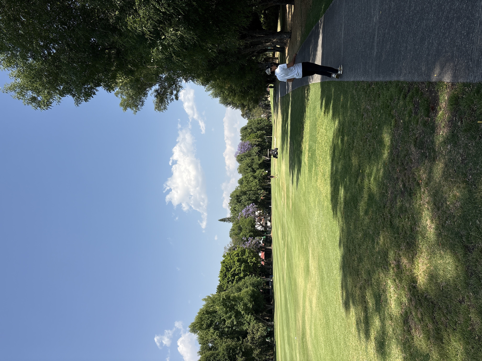 The image displays an outdoor scene at a golf course or large park in Atlixco, Mexico, under a clear blue sky with scattered white clouds. The primary visual elements are a vast expanse of green grass on the left and a paved pathway on the right, both bordered by numerous trees. In the foreground, a person is observed from behind, walking away from the viewer on the paved path. This individual wears a white short-sleeved polo shirt, dark trousers, and a white baseball cap. Tree shadows are cast across the path and the adjacent grass. In the mid-ground, a dark-colored golf cart is positioned on the green grass to the left of the pathway. Another person is visible walking on the grass further down the course, near a white golf pin flag. A line of varied trees, some displaying distinct purple blossoms (consistent with Jacaranda trees), forms a boundary beyond the grass. Partially visible through these trees are white buildings with reddish roofs. A third, less distinct figure can be seen walking further down the paved path in the mid-ground. The overall lighting suggests a sunny day.